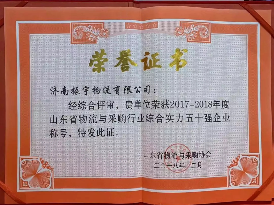 振宇物流經(jīng)山東省物流與采購協(xié)會綜合評審,榮獲2017-2018年度山東省物流與采購行業(yè)綜合實力五十強(qiáng)企業(yè)稱號。